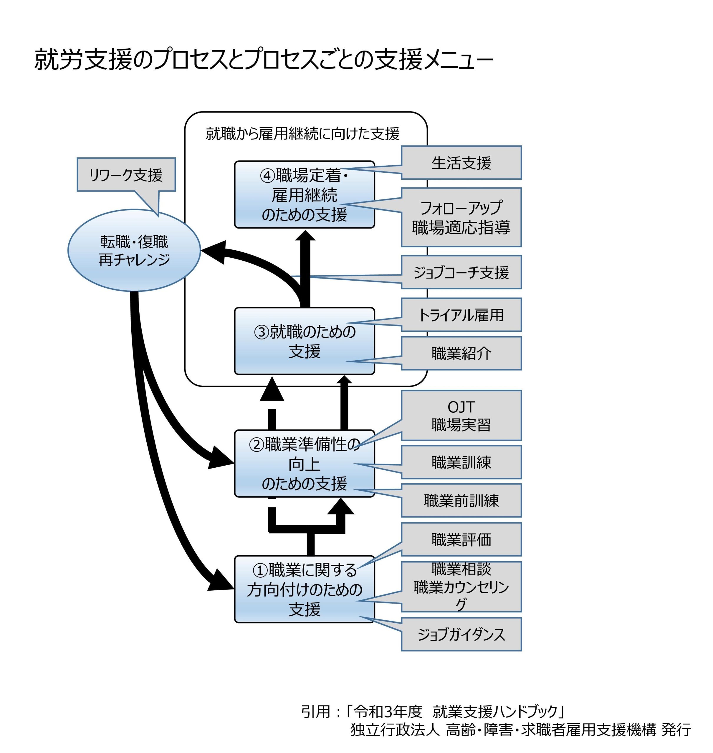 支援の起点である職業相談の受付(インテーク)から、就職準備、就職、就職後の職場定着までの一連の就労支援の流れを下図に示しています。各プロセスや主な支援メニューに関する事の詳細は記事をお読みください。